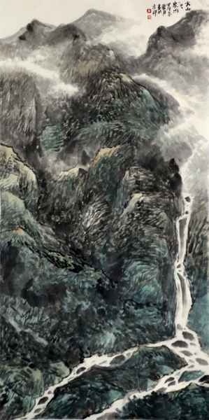 张馨月女士的画作,布局饱满,多以高远法构图,近景以大块岩石或浅流入景,以绵延不断地水流作为构图的主脉络,将画面重心置于右侧,整体布局搭配合理。在山石的勾勒与皴法上,小斧劈与粗笔之法相结合,多种皴法的结合丰富了画面的层次感,使欣赏者有一种景已尽而意无穷的感觉。