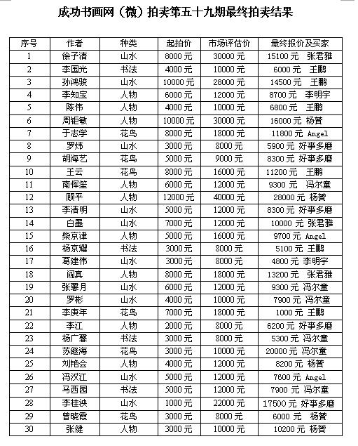 成功书画家网7月29日讯 成功文化集团主办的成功书画作品网拍(微拍)第五十九期拍卖于7月25日下午15:00开拍。成功书画网(微)拍第五十九期拍卖拍出的30幅书画作品均是书画家的佳作,成功书画网(微)拍将继续推出更多经得住市场考验的书画作品。成功书画家网(微)拍活动所拍出的书画作品均在《神州诗书画报》、《当代书画家》刊登,或成功书画家网预展。本次拍卖活动于7月29日下午17:40圆满结束。