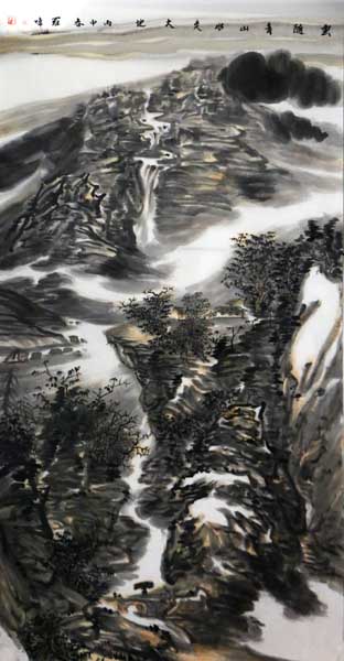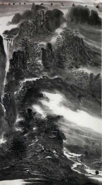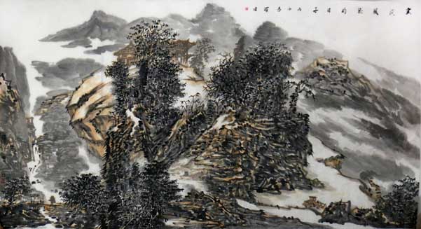 罗炜先生的的山水画作,墨色厚重、元气淋漓,以浓重的墨色将山水苍润、沉郁之色带给读者。其绘画往往在大面积的墨色晕染,与促狭巧妙的留白对比中,呈现其对于国画黑白关系的理解与呈现。《云随青山》《溪山》《云淡风轻》的画面处理中,无一不体现画家对人与自然之间关系,以及国画艺术“知黑守白”的审美哲学。